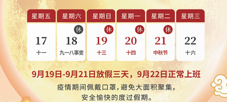 根據國務院辦公廳關于2021年部分節假日安排的通知,萬科網絡中秋節放假安排如下: